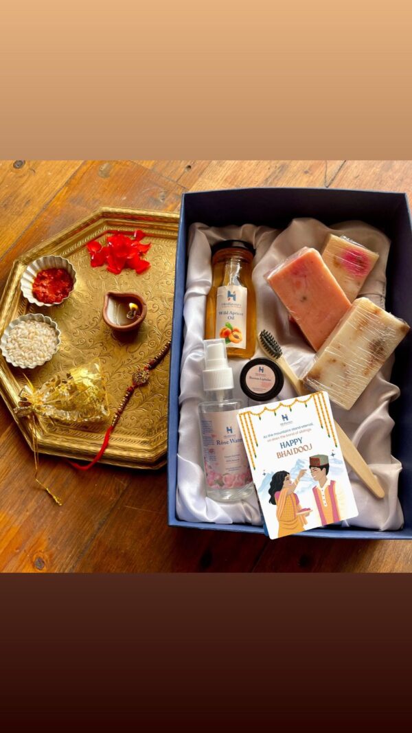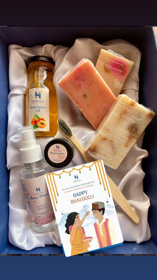 Each product is made in small batches by local artisans from Himachal Pradesh using traditional methods and chemical-free formulations. Complete with Kumkum-Chawal, and a festive card, this box is as meaningful as it is pampering.