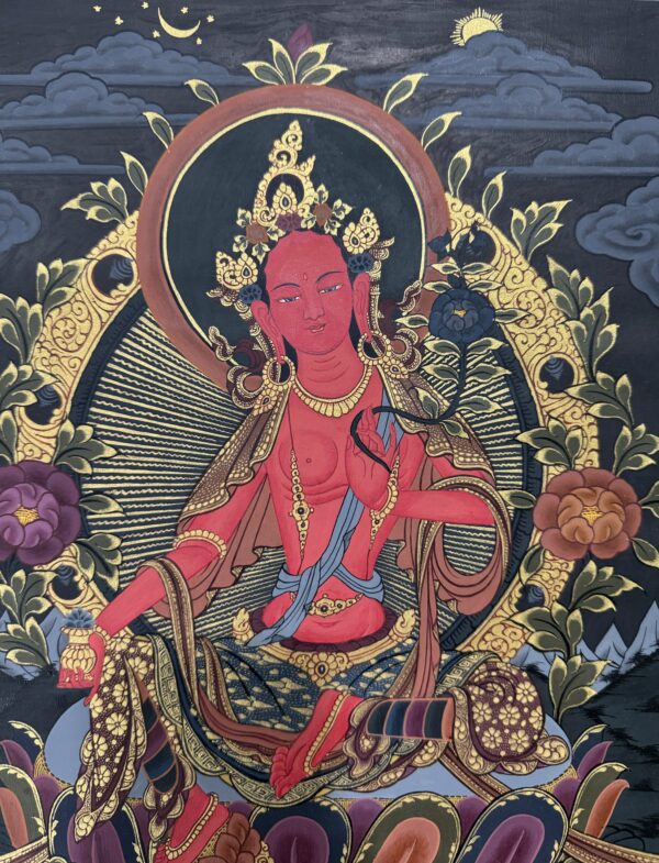• Sacred Depiction of Red Tara – Represents magnetism, transformation, and compassionate protection in Tibetan Buddhism.