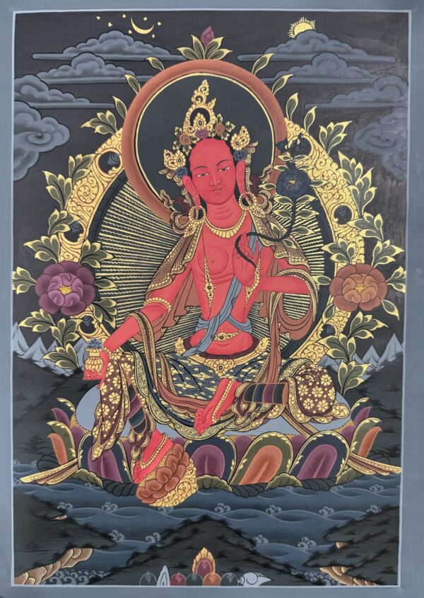 This Red Tara Thangka Painting is not just a sacred image but a masterpiece of traditional Himalayan art. Carefully painted by trained artisans, it is created using natural stone colors, handmade paper, and real gold detailing. Each brushstroke requires patience, devotion, and precision, making every painting a unique spiritual treasure.